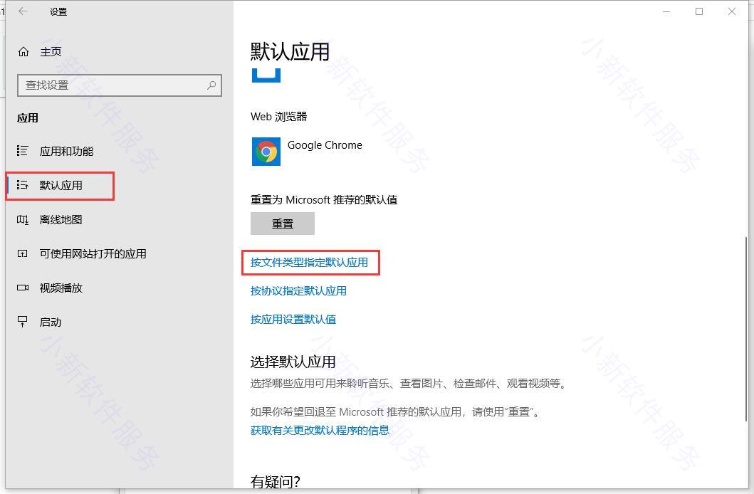 点击“应用”进入,在侧边栏中就有“默认应用”,点击展开,在下方有一个“按文件类型指定默认应用”的链接。